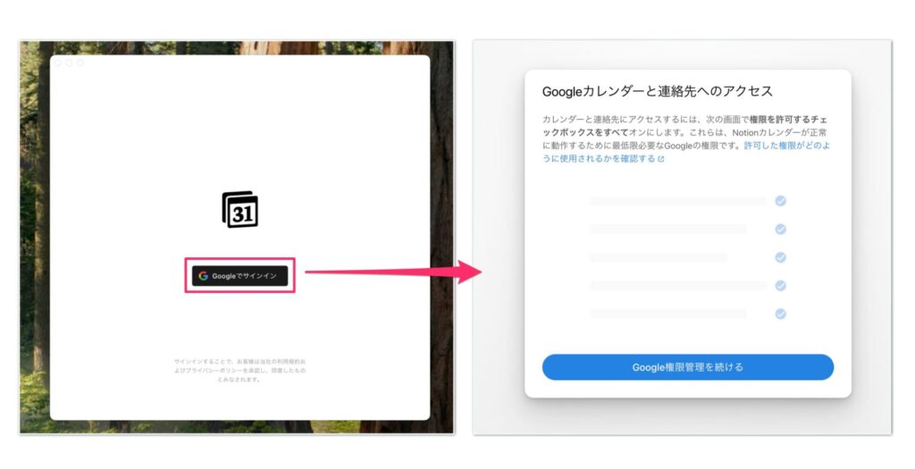 ログイン時はNotionで利用しているGoogleアカウントを利用すると、すぐにNotionで利用しているカレンダー情報と連携に進むことができます。また、Googleカレンダーアカウントは後から他のアカウントを追加できるので、もし他のアカウントでログインしてしまった場合でも大丈夫です。