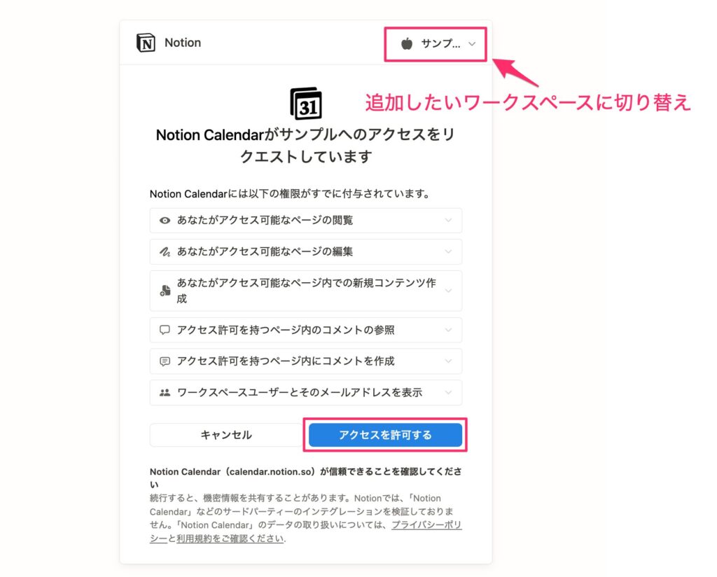 - Notionのアクセス許可画面で追加したいワークスペースに切り替える