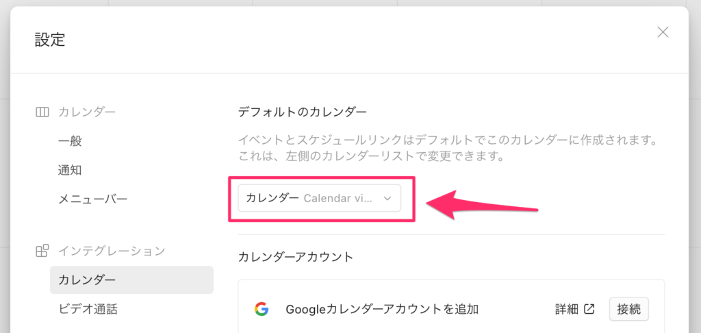 デフォルトのカレンダーは初期設定ではGoogleカレンダーが指定されています。Notionカレンダーへの登録が多い場合はデフォルト設定を切り変えることで新規予定作成時にNotionカレンダーへ登録をすぐに行うことができます。デフォルトのカレンダー設定の方法は以下の設定画面から行います。
